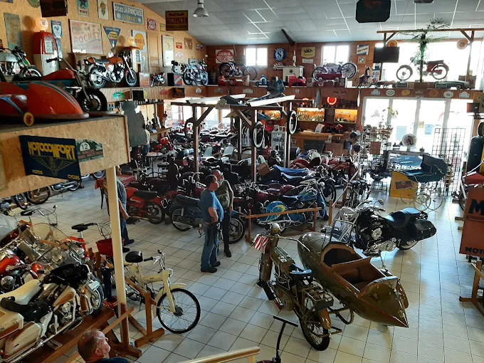 Situé à Riom (63), le Musée Baster rassemble entre 800 et 1000 deux-roues (motos, side-cars, cyclomoteurs, scooters, vélos) datant de 1905 à environ 1985. Il ne s’agit pas seulement d’un stock d’objets, mais d’une scénographie : plaques émaillées, bidons d’huile, affiches anciennes, pompes à essence ; un décor immersif qui rappelle l’époque des machines à essence fumantes.